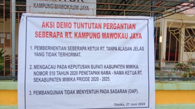 TIMIKA| Sejumlah RT Dan Kepala Dusun melakukan aksi demo Kantor Kampung Mawokauw Jaya, Distrik Wania,Kabupaten Mimika atas dugaan tindakan yang dilakukan secara sepihak oleh Kepala Kampung Mawokauw Jaya memberhentikan Tujuh Ketua RT, Tiga Aparat Kampung dan Satu Kepala Dusun.