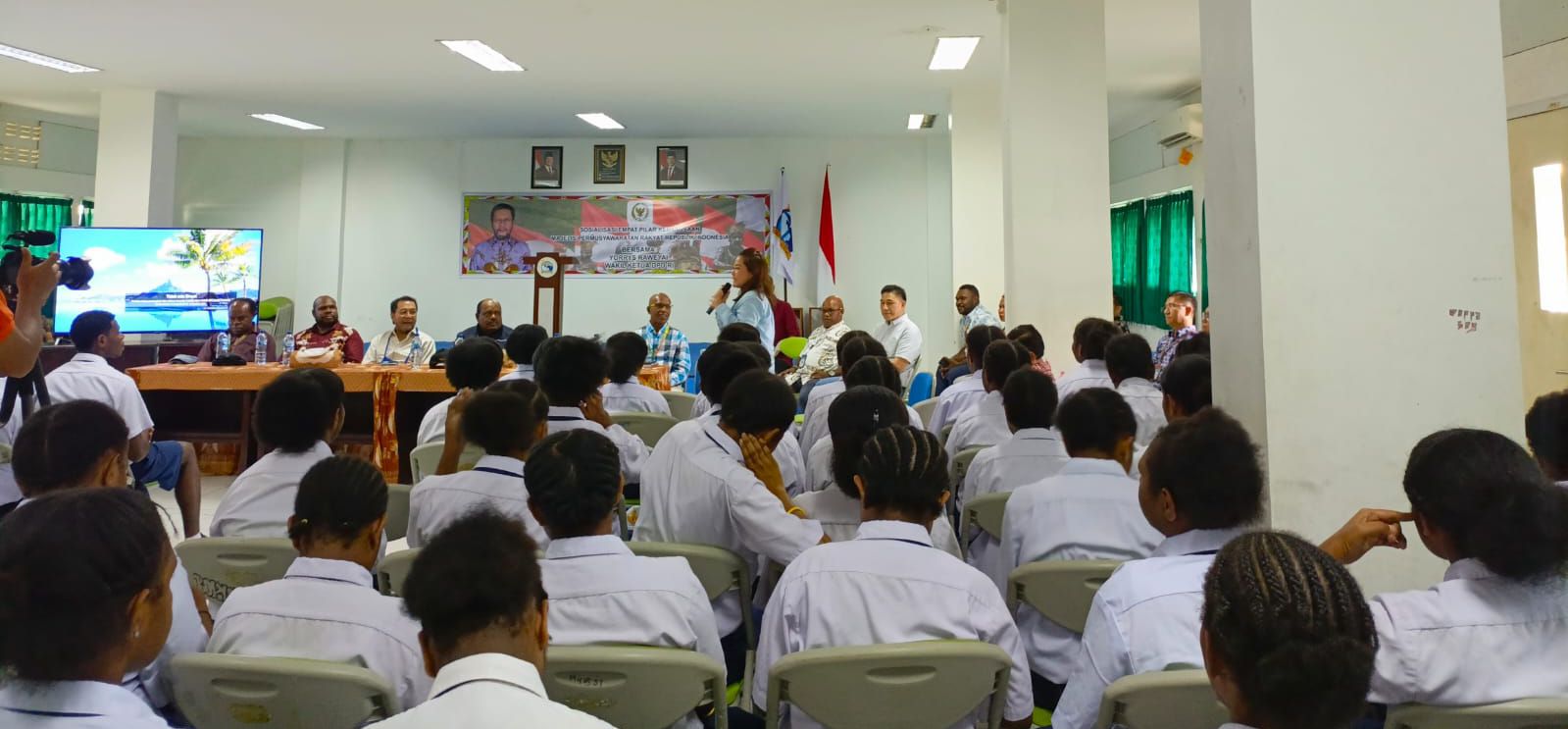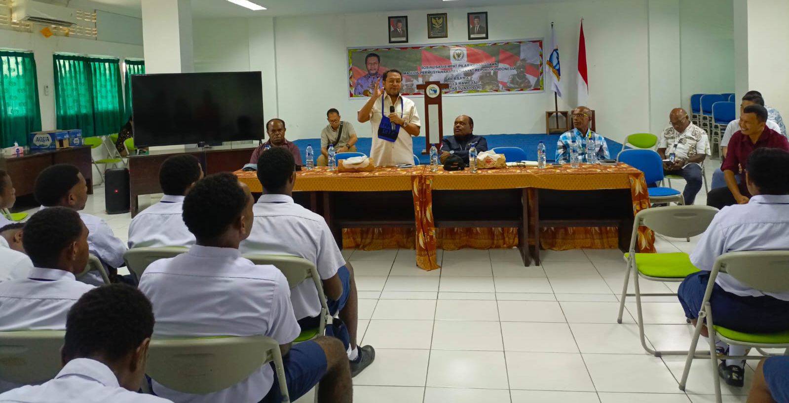 TIMIKA TAMBELO-Yorrys Raweyai Wakil Ketua DPD RI Gelar Sosialisasi Pilar Kebangsaan Majelis Permusyawaratan Rakyat Indonesia dengan para siswa-siswi SATP di SP 4 , Kelurahan Wonosari Jaya, Distrik Wania, Kabupaten Mimika.