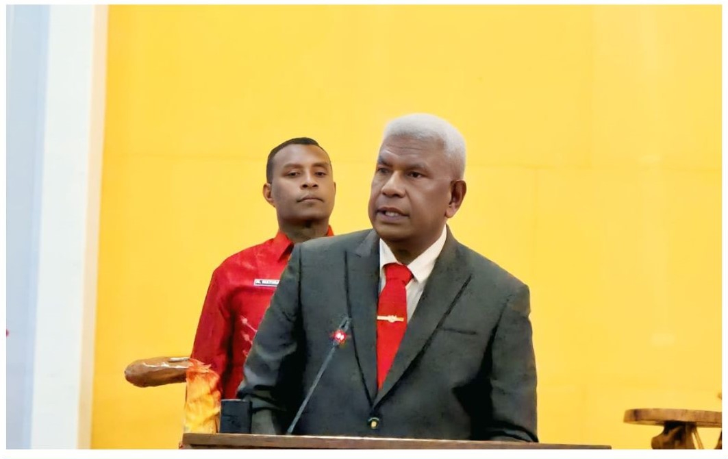 TIMIKA| Bupati Kabupaten Mimika, Johannes Rettob,S.Sos, MM menjawab delapan Pandangan Umum fraksi-fraksi di DPRK Mimika terkait Laporan Keterangan Pertanggungjawaban (LKPJ) dan Pertanggungjawaban Pelaksaan APBD (PP-APBD) kabupaten Mimika tahun 2024 yang disampaikan pada Rapat Paripurna III Masa Sidang II yang digelar DPRK Mimika di ruang Sidang Kantor DPRK Mimika, Jumat (4/7/2025).