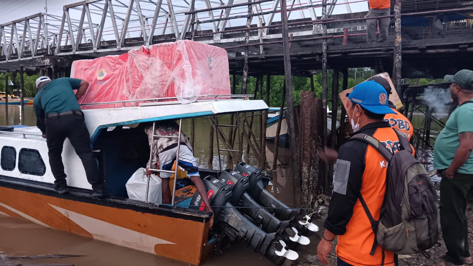 TIM BPBD MIMIKA BESERTA BANTUAN TIBA DI DERMAGA APUNG KAMPUNG AIKAWAPUKA DISTRIK MIMIKA TENGAH
