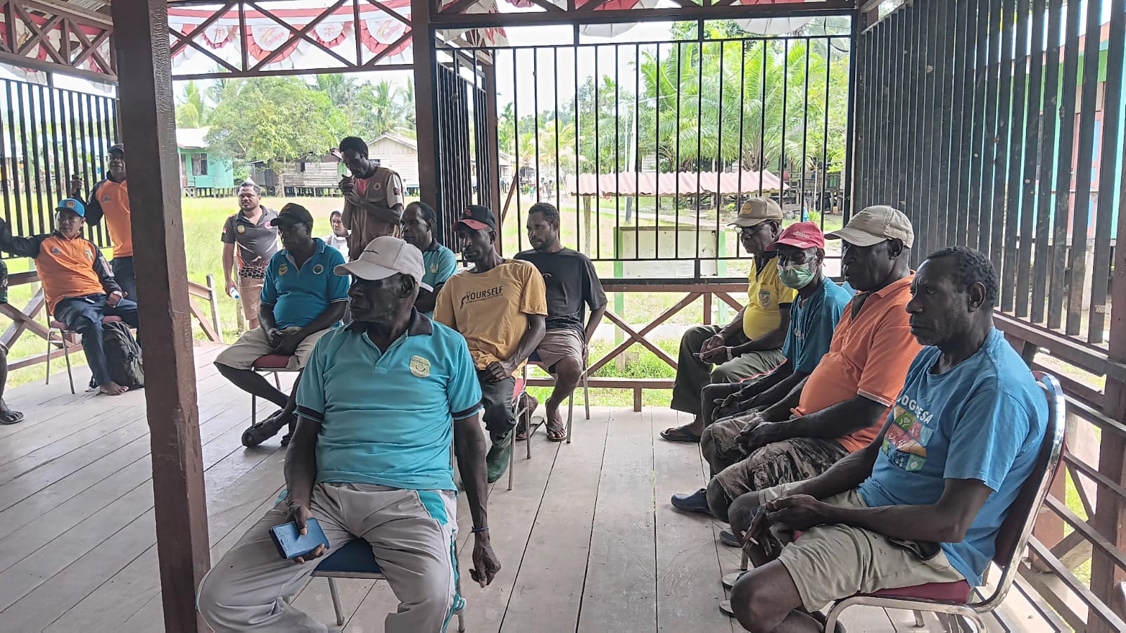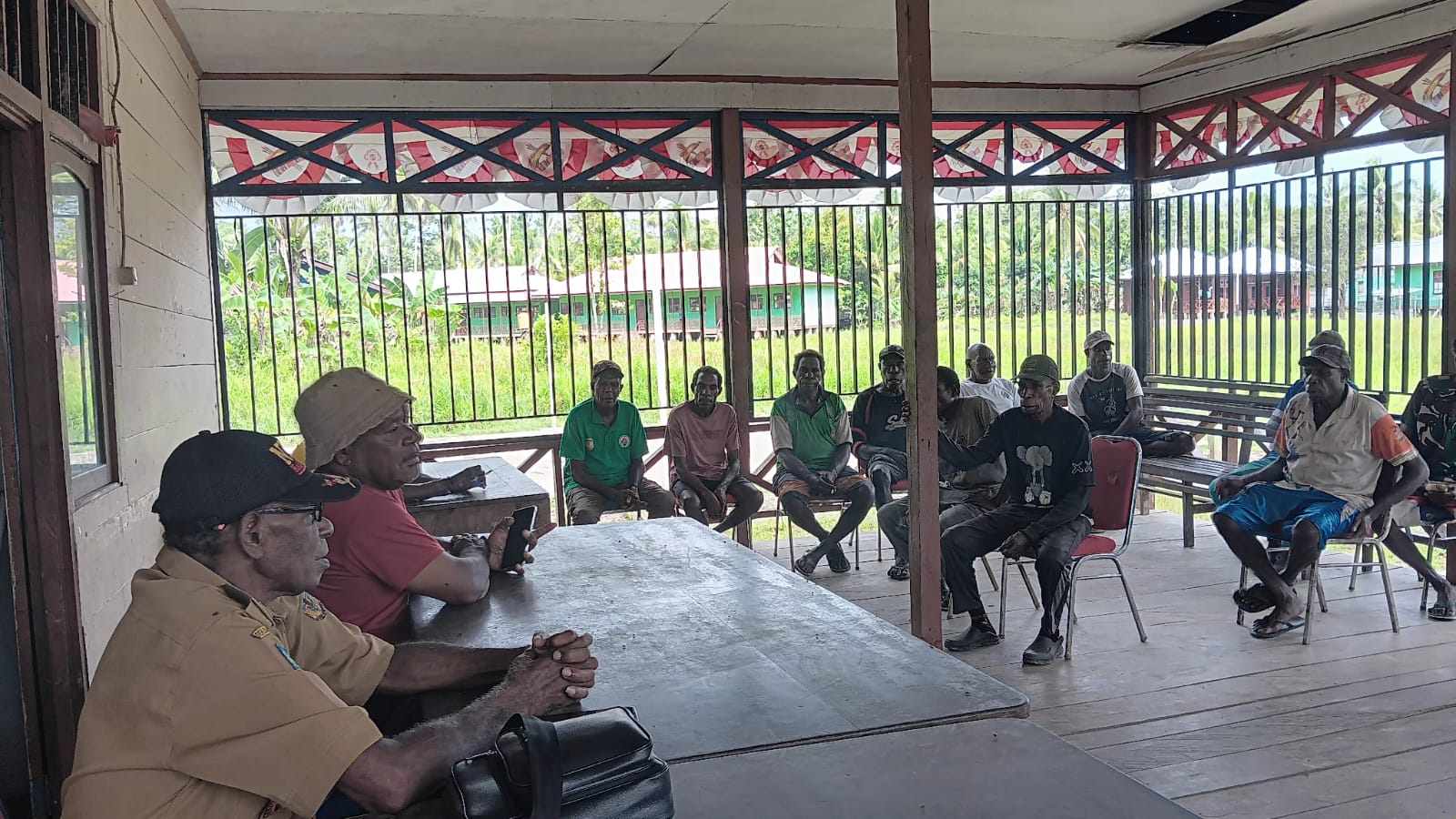 MOMEN FOTO BERSAMA MAXI KELANANGAME. S IP. KEPALA SEKSI LOGISTIK DAN BANTUAN BENCANA BPBD KABUPATEN MIMIKA & TIM BPBD KABUPATEN MIMIKA BERSAMA KEPALA KAMPUNG DAN MASYARAKAT DI KANTOR KAMPUNG AIKAWAPUKA
