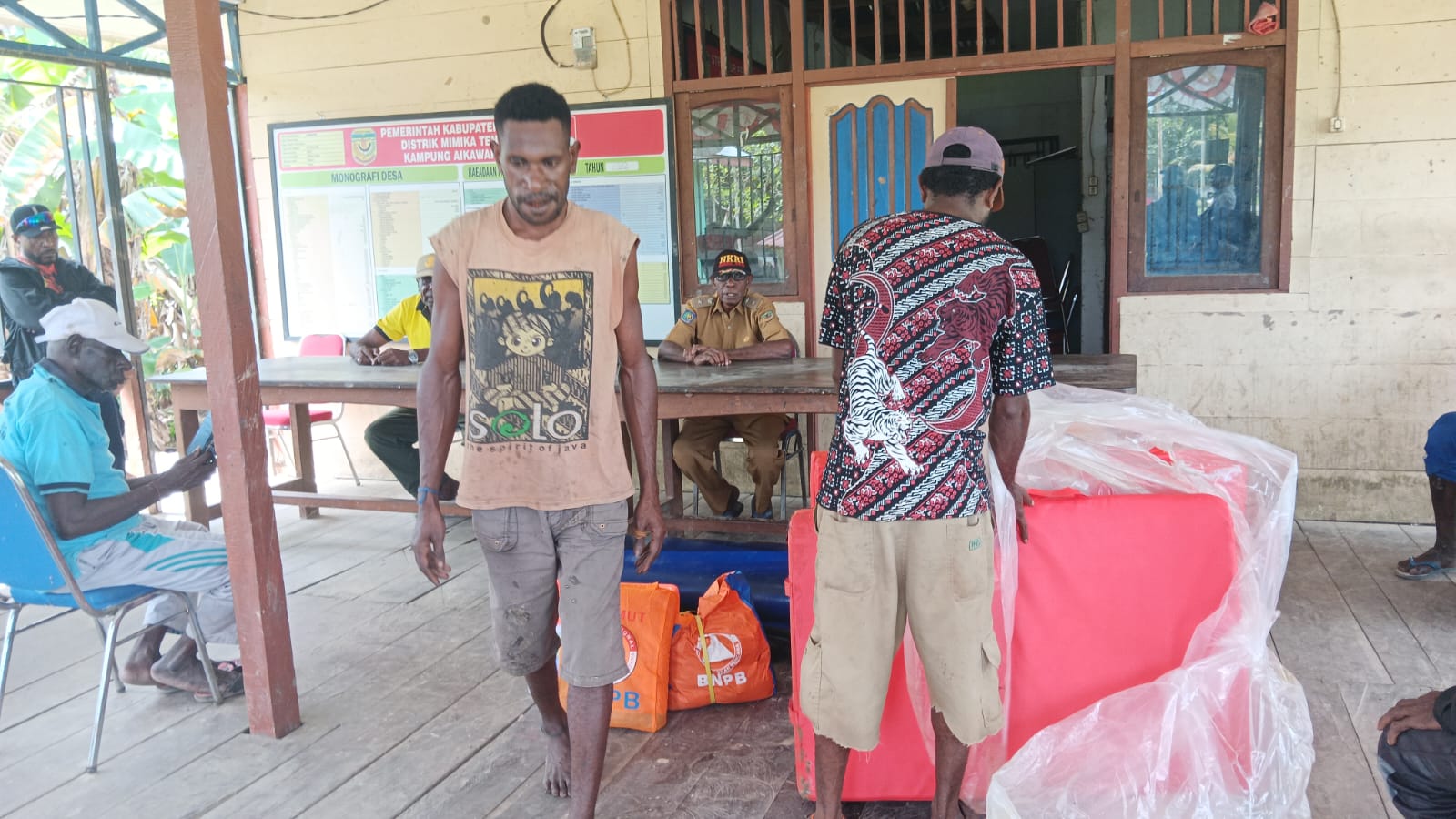 MASYARAKAT KAMUNG AIKAWAPUKA ANTUSIAS MENYAMBUT BANTUAN DARI PEMERINTAH KABUPATEN MIMIKA MELALUI BADAN PENANGGULANGAN BENCANA DAERAH.