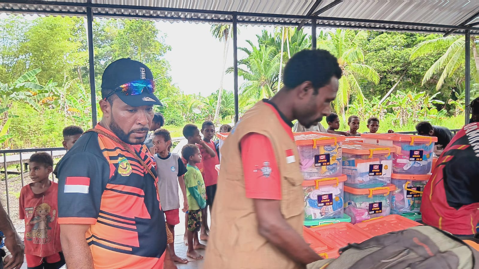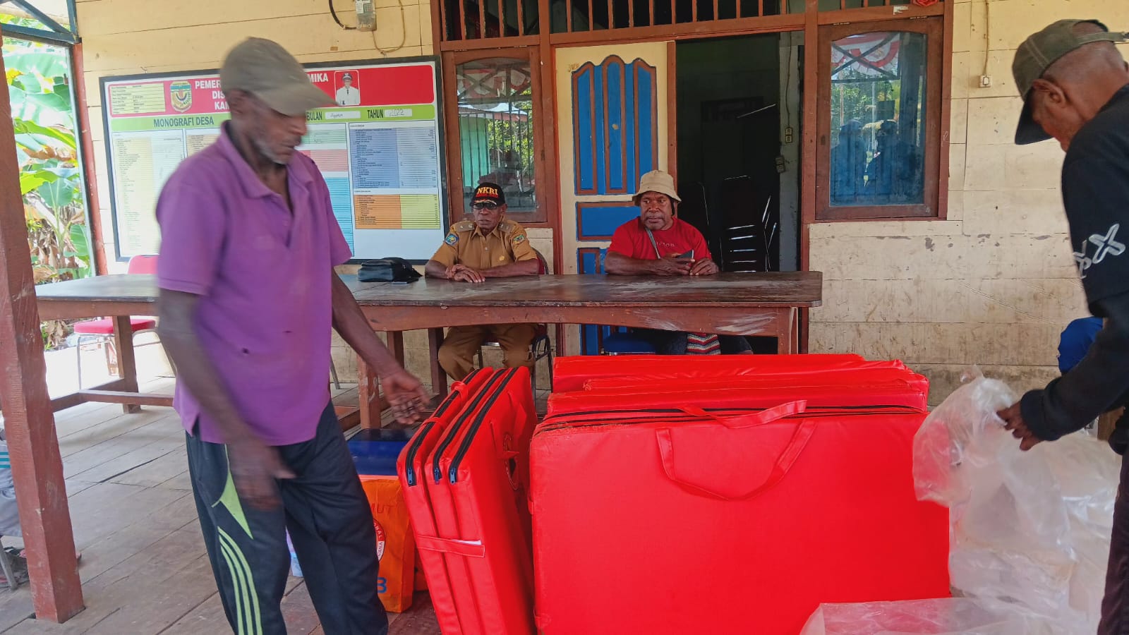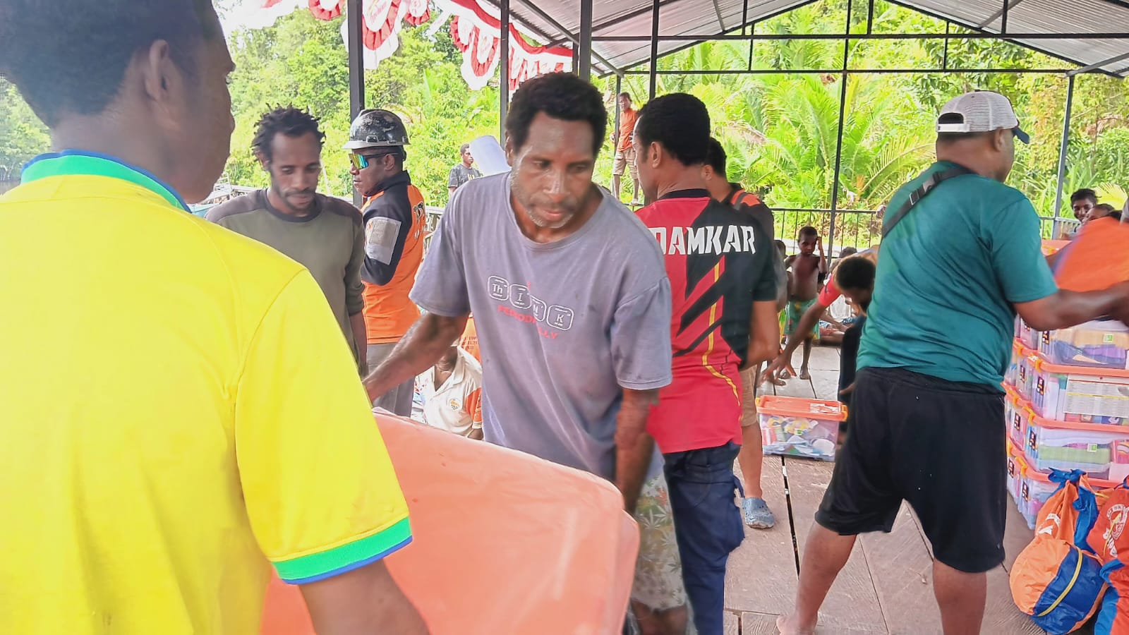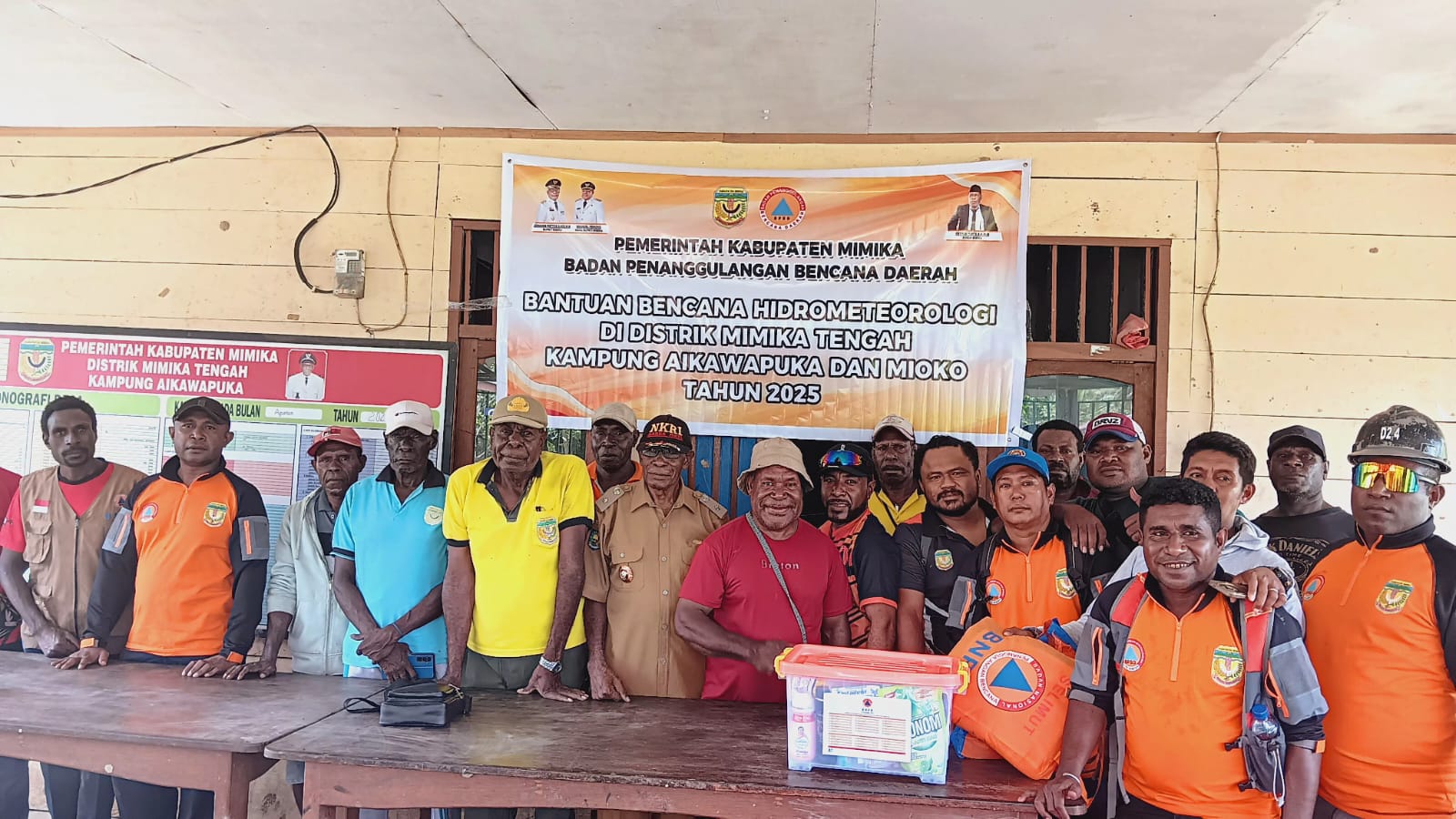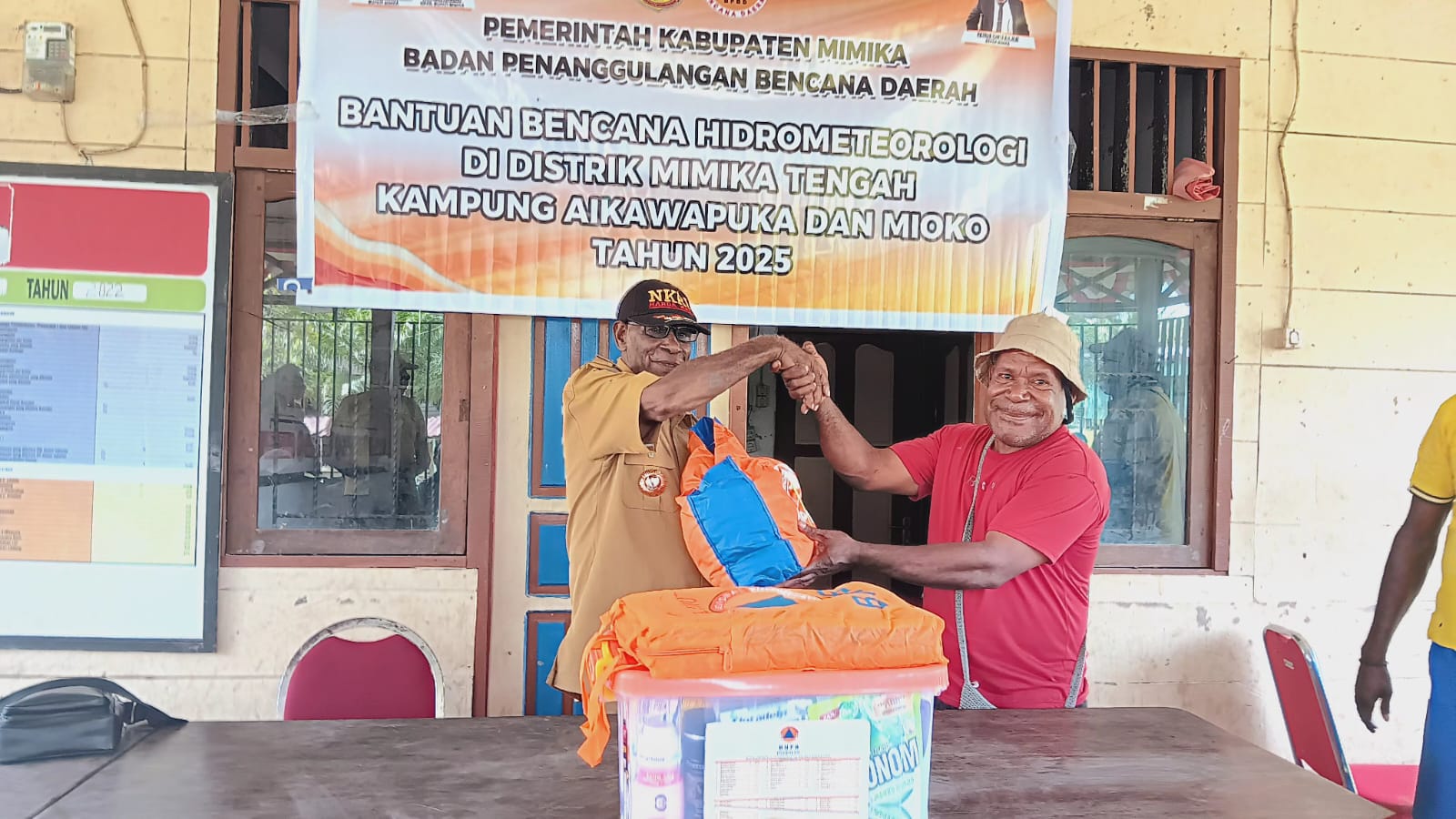MAXI KELANANGAME. S IP. KEPALA SEKSI LOGISTIK DAN BANTUAN BENCANA BPBD KABUPATEN MIMIKA BERSAMA TIM BPBD MIMIKA MENYERAHKAN 150 PAKE BANTUAN BENCANA HIDROMETEOROLOGI KEPADA MASYARAKAT DI KAMPUNG AIKAWAPUKA DISTRIK MIMIKA TENGAH.(9 JULI 2025)