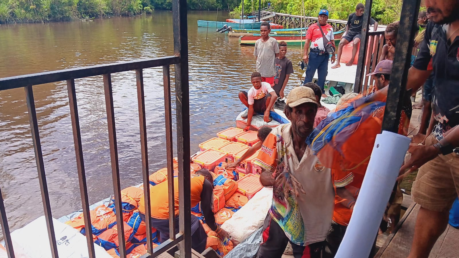 TIM BPBD MIMIKA DI BANTU MASYARAKAT MEMBONGKAR BANTUAN DARI PERAHU KE DERMAGA KAMPUNG AIKAWAPUKA