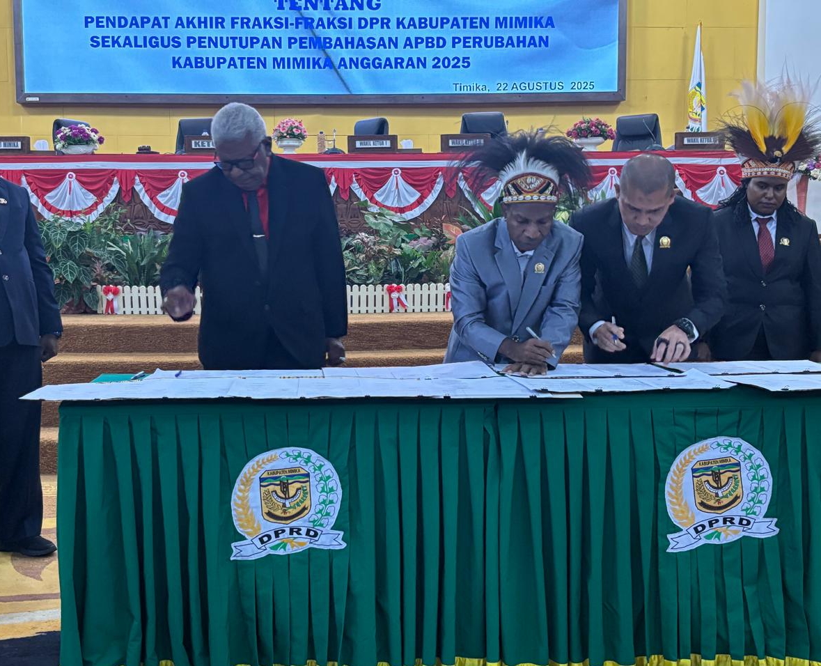 Setelah disahkan, Ketua dan Wakil Ketua DPRK Mimika bersama Bupati Mimika Johannes Rettob menanda tangani berita acara penetapan Perda APBD Perubahan 2025 secara bersamaan.