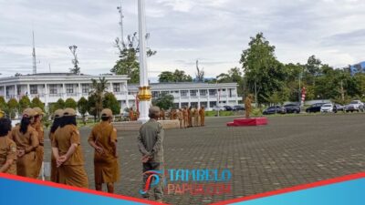 Bupati Mimika Johannes Rettob, didampingiEmanuel Kemong Wakil Bupati saat memimin apel gabungan di Kantor Bupati…